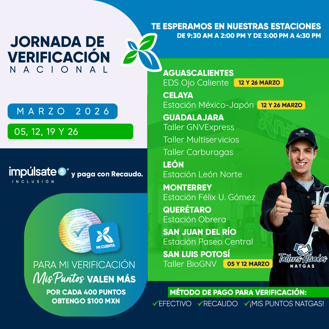 ¡Al realizar la verificación anual de tu equipo GNV de forma anticipada ⏰ en nuestras jornadas de verificación nacional, te reembolsamos hasta $500 MXN en litros Natgas.
